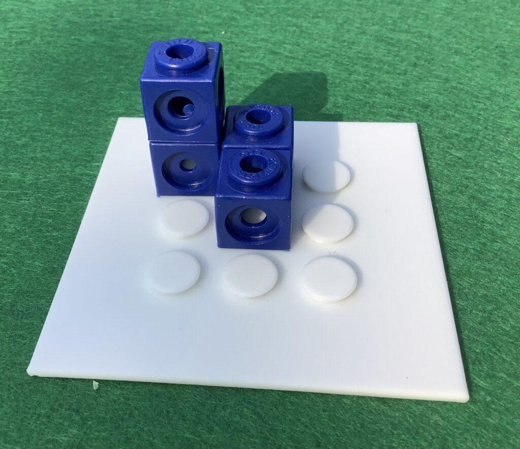 In many maths books for primary school, you will find tasks on cube buildings in which a corresponding construction plan is illustrated. I usually have blind pupils recreate these cube buildings using pegboard cubes. It is very helpful if they can use a fixed base plate. Most building plans are designed for base plates measuring 3 x 3 or 4 x 4.